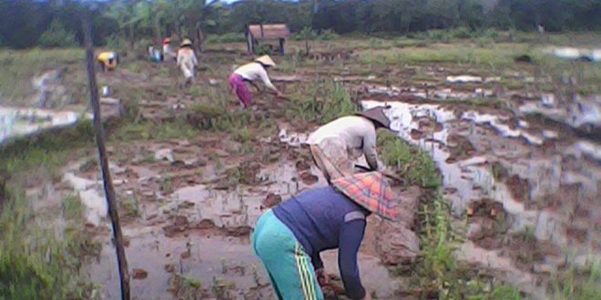 pengelolaan sawah di lakukan oleh petani dengan peralatan sedarhana, proses mencangkul setelah dibajak ini dilakukan oleh ibu-ibu dengan jumlah 6 (enam) orang, dan dikerjakan secara gotong royong sehingga tidak ada ketertinggalan dalam pengelolaan ini.