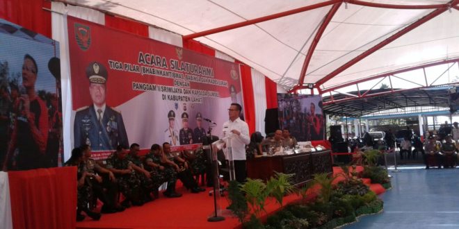 LAHAT, LhL – Acara silaturahmi tiga pilar (Bhabinkamtibmas, Babinsa dan Kades/lurah) dengan Pangdam II Sriwijaya dan Kapolda Sumsel di Kabupaten Lahat hari ini Rabu (19/07) berjalan lancar dan aman. Pantauan pewarta di tempat acara sejak dari pukul 08.00 wib seluruh unsur TNI, Polri dan pemerintahan Kabupaten Lahat sudah memenuhi Pendopoan Rumah Dinas Bupati Lahat.