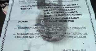 Author : Ganda Coy LAHAT, LhL – Setelah pagi hari tadi Rabu (30/8/17) ratusan warga lahat dihebohkan kabar bohong dari broser dan spanduk akan adanya pembagian sembako secara gratis, siang ini warga juga dikejutkan selembaran kertas HPS yang bertuliskan penukaran tabung Gas LPG secara gratis atas nama PT. Pertamina Persero …