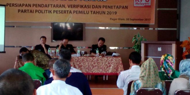PAGAR ALAM, LhL – Dalam rangka penetapan Partai Politik yang akan ikut pada Pemilu 2019, Komisi Pemilihan Umum (KPU) Kota Pagaralam melakukan bimbingan teknis kepada partai politik. Bagi Partai Politik yag baru untuk bisa ikut pada Pemilu mendatang haruslah lulus verifikasi faktual sesuai dengan ketentuan dan UU Pemilu 2017.