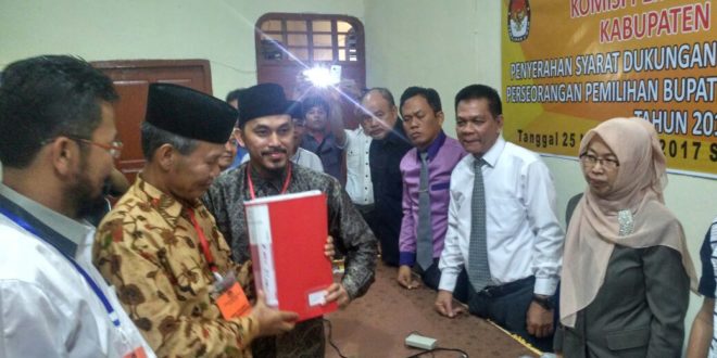 LAHAT, LhL – Bakal calon Bupati Lahat dan Wakil Bupati Lahat via jalur independen, Drs H Purnawarman Kias SH bersama pasanganya Rozi mendatangi kantor KPU Lahat guna menyerahkan syarat dukungan bakal calon perseorangan pemilihan Bupati dan Wakil Bupati Lahat tahun 2018 dan syarat- syarat lainya. Senin (27/11/17).