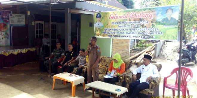 MULAK SEBINGKAI, LhL- Musyawarah Desa (Musdes), adalah musyawarah perencanaan pembangunan skala prioritas yang diputuskan dalam Musyawarah desa. Sebab itu dalam penggunaan dana desa wajib diadakan musyawarah desa. Seperti hari ini Jum’at (15/12) Desa Padang Bindu Kecamatan Mulak Sebingkai melaksanakan Musdes untuk penggunaan dana desa tahun 2018.