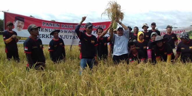 LAHAT, LhL – Bersama masyarakat Desa Tanjung Bai, Kecamatan Tanjung Tebat, Kabupaten Lahat Calon Bupati Lahat H. Bursah Zarnubi, SE melaksanakan panen raya padi disalah satu lahan persawahan milik warga desa setempat. Panen bersama ini dalam kegiatan Upsus (Upaya khusus) Swasembada pangan berkelanjutan di Kabupaten Lahat, Rabu (24/01/18).