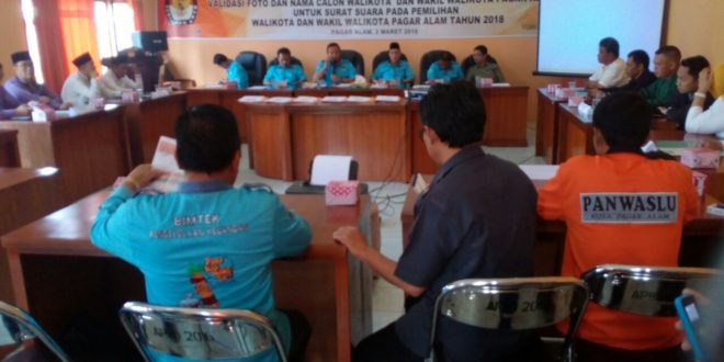 PAGARALAM, LhL – Demi untuk kecocokan dan kesesuaian foto dan nama calon Walikota dan Wakil Walikota yang bakal dipasang pada surat suara pada Pilkada Kota Pagaralam, Selasa (02/03/18), Komisi Pemilihan Umum (KPU) Kota Pagaralam menggelar rapat koordinasi dengan 6 Paslon.