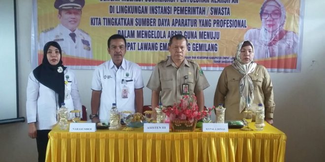 Empat Lawang, LhL – Dinas Perpustakaan dan Kearsipan Kabupaten Empat Lawang mengadakan sosialisasi yang bertajuk penyuluhan kearsipan di lingkungan instansi pemerintah dan swasta dengan moto “Kita tingkatkan sumber daya aparatur yang propesional dalam mengelola arsip guna menuju Empat Lawang EMASS yang Gemilang” di aula Armina Hotel Zulian Transit Tanjung Beringin Tebing Tinggi, Selasa (3/4) sekitar pukul 09:30 wib
