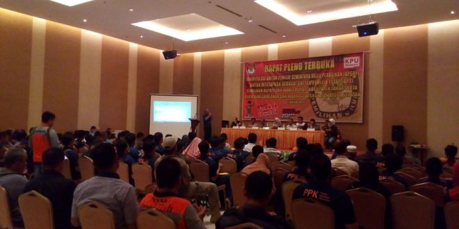 LAHAT, LhL – Sidang rapat pleno terbuka yang digelar Komisi Pemilihan Umum Daerah (KPUD) Lahat pada hari Kamis (19-04-18) malam, dipusatkan di Ballroom Hotel Grand Diri Lahat dimulai pada pukul 21 :00. Rapat pleno terbuka dihadiri seluruh Panitia Pemilihan Kecamatan (PPK) se-Kabupaten Lahat, Panwaslu Lahat, KPU Provinsi, Kesbangpol, perwakilan pasangan calon Gubernur dan Bupati, dan Sekretariat KPUD Lahat.