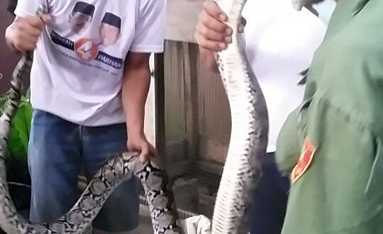 LAHAT, LhL – Sontak seekor ular jenis python sepanjang 3,5 meter gegerkan warga RT 06 RW 02 Kelurahan Kota Negara Kecamatan Kota Lahat, Sabtu (28/4) dini hari. Pasalnya, ular bernama lain “Sanca” ini, ditemukan Rusbaiti tengah berada di dalam sangkar ayam milik warga setempat. Diduga, ular tersebut telah memangsa seekor ayam jantan dewasa.