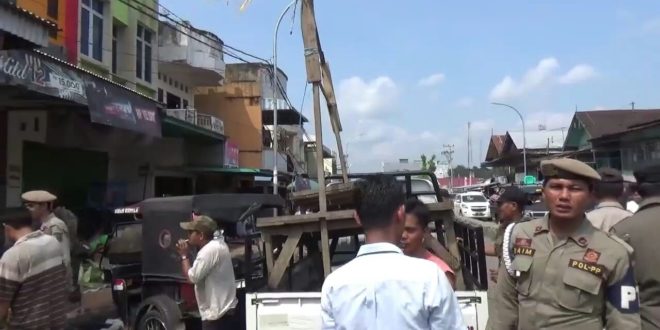 EMPAT LAWANG, LhL – Satuan Polisi Pamong Praja (Pol-PP) Kabupaten Empat Lawang di back up Polres Empat Lawang melakukan penertiban terhadap ratusan Pedagang kaki lima (PKL) yang menggelar lapak di sepanjang bahu jalan dan trotoar jalan lintas tengah Sumatera (Jalintengsum) tepatnya di Jln. Abubakardin Pasar Tebing Tinggi Kabupaten Empat Lawang, Minggu (17/06) sekira pukul 10:30 Wib.