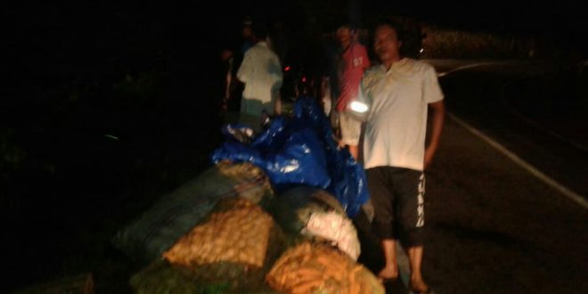 Tambahnya, warga langsung bergegas membantu mengangkat karung sayuran dan buah ke atas (pinggir jalan) dari mobil yang berada di dalam jurang tersebut.
