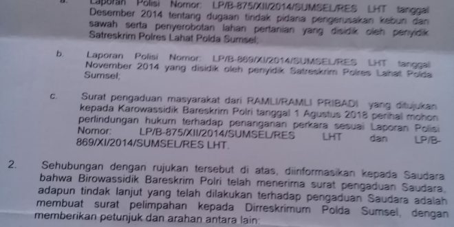 Dalam isi surat tersebut, penyidik mabes polri memberikan mandat atau perintah tugas kepada Polda Sumsel dan Polres Lahat untuk segera mengelar perkara antara pelapor dan terlapor terkait permasalahan konfensasi lahan.