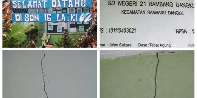 MUARA ENIM, LhL – Sungguh miris dan menyedihkan proyek kondisi fisik bangunan gedung sejumlah sekolah yang ada di Dinas pendidikan dan Kebudayaan Kabupaten Muara Enim. Pasalnya, belum lama dibangun sudah mengalami keretakan. Bahkan satu bangunan ada yang mengalami lebih dari sepuluh titik keretakan.