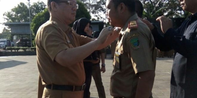 Dalam Apel pagi itu juga dia menyampaikan sebanyak 36 ASN yang di berikan penyematan tanda pangakat dan kenaikan jabatan.