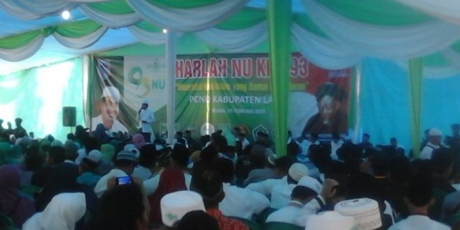 “Ucapan terima kasih kepada pemerintah Daerah maupun Dinas dan Instansi lainnya sehingga acara hari ini bisa terselenggara dengan baik. Tujuan utama dalam rngka hari ulang tahun NU didalam berkumpul bersama mendoakan semoga Negri kita selalu dalam perlindungan Allah SWT, di jauhi dari segala permasalahan. Dengan ini mengingatkan kita semua terutama bagi semua pengurus NU, Kyai dan ulama agar dapat mengikuti peradapan perkembangan di dalam melindungi, menjaga kerukunan yang ada sesuai dengan falsafah Pancasila sebagai dasar Negara, ” tuturnya.