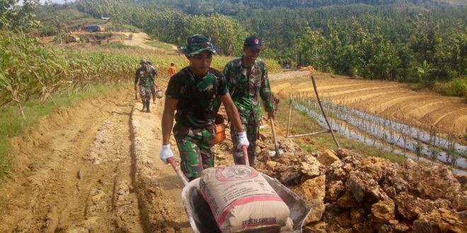 BLORA – TNI manunggal membangun desa( TMMD)reguler 104 tahun 2019 kodim 0721/blora yang di selenggarakan di desa jurangjero kecamatan bogorejo kabupaten blora.Satgas TMMD reguler 104 tahun 2019 yang akan di bangun sarana fisik berupa pembangunan jalan makadam 1,360 meter dan pembangunan talud.Terlihat anggota satgas TMMD bekerja keras melangsir bahan matrial ke lokasi TMMD pembuatan talud. Bati Bhakti TNI kodim 0721/blora peltu Haryanto,”Banyaknya pembangunan talud di lokasi TMMD ada beberapa tipe membuat kita harus melangsir atau memindakan pelaratan,matrial semen ke lokasi pembangunan TMMD”ungkapnya. Semangat anggota satgas TMMD bersama warga terlihat mengangkat matrial demi mempercepat pembangunan dan mensukseskan program TMMD reguler 104 tahun 2019.