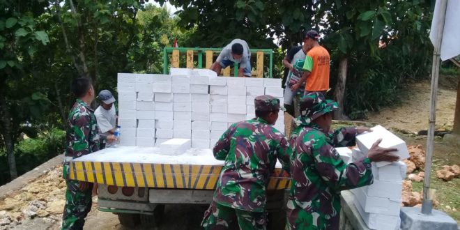 BLORA – Sehari setelah TMMD dibuka, sejumlah satgas TMMD Reguler ke-104 Kodim 0721/Blora mulai menyentuh sasaran fisik rehab RTLH milik beberapa warga setempat. Salah satunya perehaban rumah Sutiyono (31) warga RT 03/RW 03 Dukuh Goloyo, Desa Jurangjero. Sejumlah material telahdidatangkan ke rumah Sutiyono yang kondisinya memprihatinkan. Datangnya sejumlah material yang akan digunakan untuk merehab rumahnya, Sutiyono dan sekeluarga menyatakan lega, gembira, karena sebentara lagi dia mempunyai rumah yang layak huni. Saat material datang, baik TNI maupun warga saling bahu membahu menurunkan material berupa batu bata helbel, semen perekat dan pasir. ”Syukur alhamdulillah rumah saya akan segera dibangun. terimakasih pak Tentara, sebenatara lagi saya mempunyai rumah bagus.” ungkap Sutiyono. (Pendim 0721/Blora)