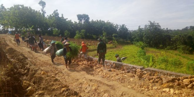 BLORA – Meski pengerjaan jalan makadam yang menjadi sasaran fisik utama gelaran TMMD Reguler ke-104 Kodim 0721/Blora belum rampung seratus persen, banyak warga yang sudah merasakan manfaatnya. Mulai dari pedagang sayur keliling, hingga warga yag setiap harinya masuk ke semak belukar untuk mencari pakan ternaknya. Seperti yang dirasakan warga Desa Jurangjero ini, Suwati (50), yang tiap hari pergi ke kebunnya, bahkan masuk ke hutan untuk mencari rumput sebagai pakan ternaknya. Saat itu, sambil menngendong sekarung rumput, dia mengungkapkan rasa senangnya yang tak terhingga, menyusul akan selesainya Tentara membangun jalan makadam. Kepada sejumlah anggota Satgas TMMD yang dijumpainya, Suwati(50) mengungkapkan rasa terimakasihnya. Dia mengatakan bahwa jalan sudah nyaman dan aman, sehingga dia tidak takut lagi jatuh terpeleset saat melewati jalan itu. ”Alkhamdulillah jalannya sampun diperlebar lan dibangun. Sakniki mboten ajreh maleh menawi lewat jalan mriki, Pak,” ungkap Suwati. ” “Pokoke maturnuwun nggeh pak Tentara,” imbuhnya. Terpisah Pasiter Kodim Blora, Kapten Inf. Puryanto mengungkapkan, diharapkan seluruh program TMMD di Desa Jurangjero bisa membawa dampak luar biasa bagi warga desa setempat dan sekitanya. ”Harapannya tidak sekedar memperlancar arus transportasi, melaikan juga meningkatkan perekonomi warga masyarakat,” bebernya. (Pendim 0721/Blora)