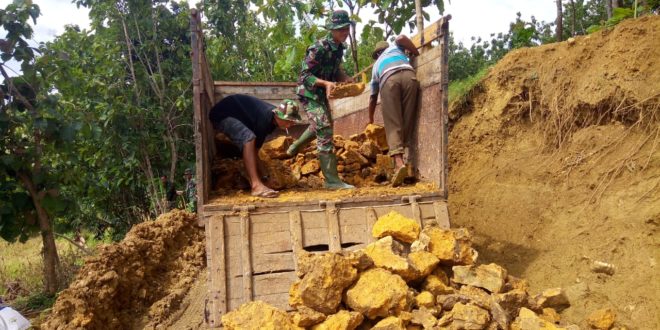 BLORA – Memasuki hari ke-27 proses pengerjaan pembangunan pondasi jalan terus dikerjakan warga dan Satgas semakin hari semakin kompak dalam bekerja. Bahan material berupa batu dan pasir sangat dibutuhkan dalam pelaksanaan TMMD Reguler ke-104 yang dilaksanakan di Desa jurangjero Kecamatan Bogorejo Kabupaten Blora. Satgas TMMD terus memastikan pasokan Batu tak terhambat, dengan menggunakan pengankut kendaraan truk, tak menjadikan Satgas TMMD berhenti memasok material tersebut. Pratu Agung salah satu anggota satgas dari yonif 410 alugoro, membantu menurunkan batu bersama warga di atas truk terbuka Bersama anggota Satgas TMMD lainya, ia terus bergotong royong tanpa mengenal lelah agar material segera digunakan untuk pembangunan dalam program TMMD Ke-104 di kodim 0721/Blora. “Material merupakan hal pokok yang harus selalu tersedia, jika terhambat pembangunan juga akan macet. Maka dari itu, ketika kendaraan pengangkut bahan martial kami bergegas menurunkannya dan membawanya bersama warga ke lokasi pengolahan agar pasokan material lancar,” ucapnya. (Pendim 0721/Blora)