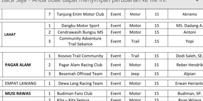 “Nah, untuk di Kabupaten Lahat ini cuma ada 3 club yang sudah terdaftar di IMI Sumsel, yaitu CBMS, Dangku Motor Sport dan CAT Sekance. Padahal kita perhatikan saat ada even, peserta lokalnya sangat banyak dari berbagai club. Sayangnya mereka ini belum terdaftar”, ungkap pemegang lisensi pengawas dan juri dari IMI Pusat ini.