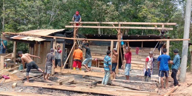 Terpantau dilapangan warga bersama Kepala Desa (Kades), perangkat Desa dan warga setempat, bahu membahu bergotong royong bersama, membersihkan puing-puing bekas kebakaran dan mendirikan rumah yang telah roboh akibat dilalap api.