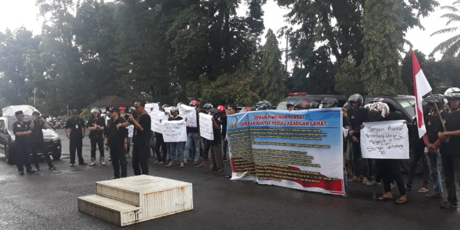 LAHAT, LhL – Kendati hujan terus mengguyur Kota Lahat, namun tak menyurutkan tekad sekitar 50 orang massa yang tergabung dalam Gerakan Rakyat Peduli Keadilan (GRPK) Republik Indonesia, sekitar pukul 10.30 hari ini, Senin (20/1/2020) yang mendatangi Kantor Pemkab Lahat. Kedatangan massa yang dihimpun LSM yang berpusat di Kabupaten Lahat ini, guna menyampaikan beberapa aspirasi terkait kebijakan umum Pemerintah Kabupaten Lahat.