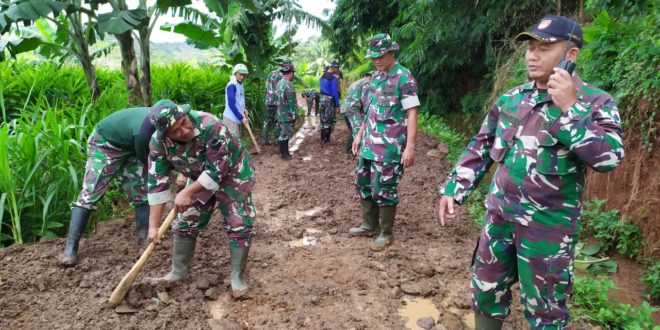 Kudus, LhL – Beberapa personil Kodim 0722/Kudus yang tergabung Satgas TNI Manunggal Membangun Desa (TMMD) kerja bakti bersama masyarakat Dusun Talun bergotong royong guna menyiapkan lokasi sasaran fisik untuk melancarkan kegiatan pembangunan jalan baru di Desa Kedungsari Kecamatan Gebog Kabupaten Kudus.Senin 9/3/2020.