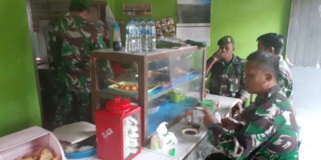 KUDUS: Di sela-sela kegiatan Pra TMMD Reguler Ke-107 anggota melepas lelah sejenak untuk makan siang dan di iringi candaan agar tidak jenuh dan di harapkan kegiatan selanjutnya akan berjalan dengan lancar,warung ibu Rumini terletak kurang lebih 100 meter dari tempat beristirahat anggota Koramil 08/Gebog.Makan siang bersama Danramil dengan anggota jadikan warung ini idola untuk meramaikan pengunjung, Kamis(12/3/2020).