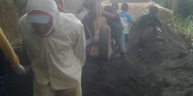KUDUS- Sejumlah anggota Satgas Tentara Manunggal Membangun Desa (TMMD) Reguler 107 Kodim Kudus kerja keras guna melaksanakan betoniaasi jalan sepanjang 900 meter x 3 meter selama masa TMMD.Jum’at 13/3/2020.