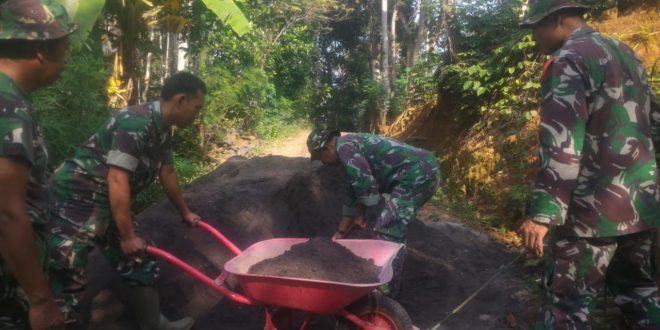 Kudus – Tidak hanya di pembangunan jalan desa, Satuan tugas TMMD Reguler ke – 107 Kodim 0722/Kudus dan warga harus bekerja keras melangsir material, di sasaran fisik perehaban rumah tidak layak huni (RTLH) milik sejumlah warga sasaran, Desa Kedungsari Kecamatan Gebog mereka juga dihadapkan medan yang sulit, sabtu (14/3/2020).