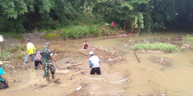 Kudus – Personel Satgas Pra TMMD di Desa Kedungsari bersama warga bergotong royong melaksanakan pembersihan sungai di Desa Kedungsari,Minggu (15/3/2020)