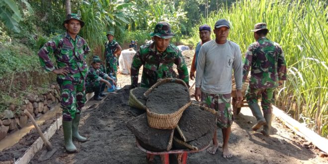 Kudus – Kucuran keringat warga dan Satgas TMMD Reg.ke-107 Kodim 0722/kudus semenjak di buka tambah terlihat bersemangat dalam pengecoran jalan di lokasi TMMD yang sedang berlangsung, di Desa Kedungsari Kecamatan Gebog Kabupaten Kudus Rabu (18/3/2020).