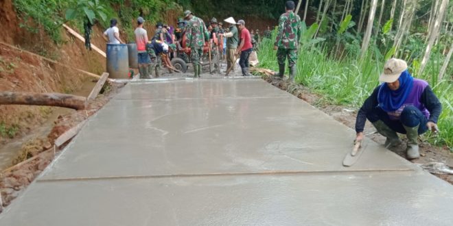 Kudus – Tentara Manunggal Membangun Desa (TMMD) Reguler ke 107 Kodim 0722/Kudus sudah memasuki hari kelima,tampak sekali hasil jerih payah yang dilakukan oleh anggota satgas TMMD bersama masyarakat.sasaran fisik berupa betonisasi jalan dengan jarak 900 m tebal 15 cm lebar 3 m sudah mulai kelihatan hasilnya.hal itulah yang membuat hati masyarakat dukuh Talun Desa Kedungsari merasa senang,kerja keras anggota satgas tampak terlihat pada,Jum’at (20/03/2020).