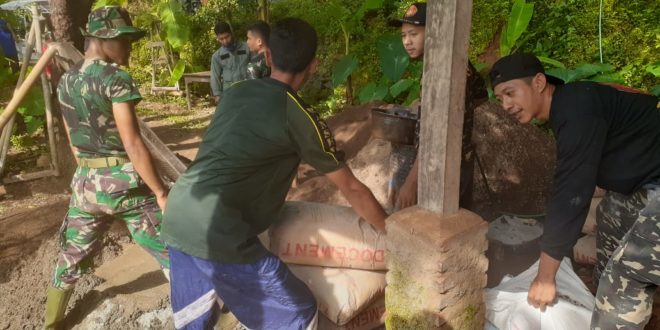 Kekompakan yang di tunjukkan salah satu Ormas “Banser” bersama satgas gabungan TMMD Kodim Kudus, bahu membau kompak menyiapkan adukan berbagai bahan material dan mengangkat semen yang akan digunakan untuk plesterisasi Rumah Tidak Layak Huni (RTLH) milik Mbah Wagimah warga Rt02/ VI Dukuh Krandu Desa Kedungsari.