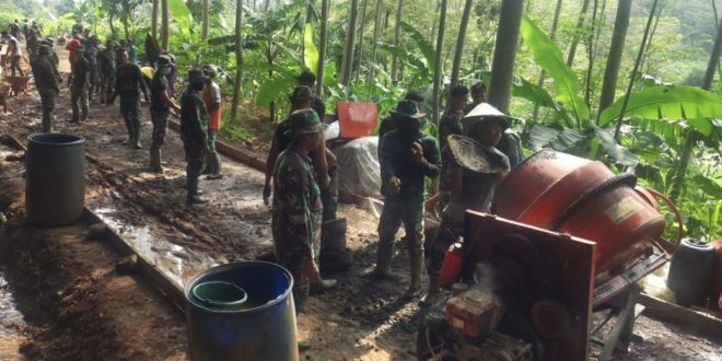 Kudus- Satgas TMMD Reg.ke- 107 Kodim 0722/Kudus ,dengan di bantu masyarakat terus bekerja untuk menyelesaikan pembangunan pengerjaan pengecoran jalan usaha tani(JUST) sebagi penghubung Dukuh Talun dengan Dukuh Mudalrejo yang ada di Desa Kedungsari, Sabtu 21/03/20.