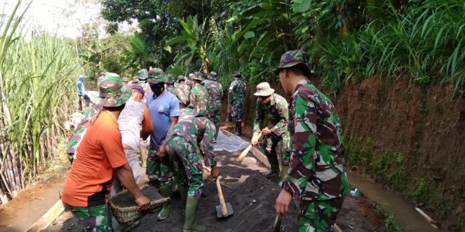 Kudus – Semangat berapi -api anggota Satgas TMMD Reg.ke – 107 Kodim 0722/Kudus sangat lah terlihat saat pengerjaan betonisasi jalan penghubung antara Dukuh Talun dengan Dukuh Mudalrejo Desa Kedungsari sepanjang 900 meter, Selasa 23/03/20.
