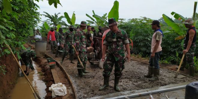 Kudus – Selaku Perwira Pengawas di lokasi sasaran fisik TMMD Reguler Ke – 107 Kodim 0722/Kudus Kapten Inf Ibnu Latifur yang saat ini menjabat Danramil 03/Undaan siang ini mengecek di sasaran fisik hasil pengecoran jalan sepanjang 900 meter tepatnya berada di Dusun Talun Desa Kedungsari Kecamatan Gebog,yang saat ini masih berlangsung pengecoran yang dikerjakan Satgas TMMD bersama warga setempat.Rabu 25/3/2020.