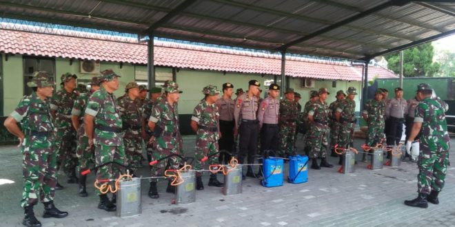 Kudus – Anggota TNI yang tergabung dalam Satuan Tugas (Satgas) Tentara Manunggal Membangun Desa (TMMD)Reg ke-107, melaksanakan apel pengecekan sebagai bagian dalam kegiatan yang akan dilaksanakan dengan jajaran instansi terbaik baik Polri Pemerintah Kabupaten Kudus,sebagai langkah awal dalam upaya pencegahan penyebaran wabah virus Corona (Covid-19) sehingga dilakukan upaya dengan cara penyemprotan desinfektan dibeberapa lokasi baik pasar Induk (Kliwon) maupun terminal Induk Jati,serta titik lain yang sudah di tentukan.Sabtu 28/03/2020.