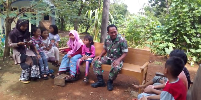 Disaat istirahat siang, anggota TNI yang tergabung dalam Satuan Tugas TMMD menghampiri anak-anak yang sedang kumpul dan duduk dikursi panjang, mereka nampak dekat sekali dan akrap seperti sudah saling mengenal.