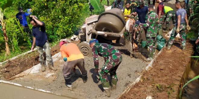 Kudus – Pembangunan yang sedang di laksanakan dalam program TMMD Reguler Ke-107 Tahun 2020 Kodim 0722/ Kudus salah satunya adalah pembangunan jalan baru di Dusun Talun Desa kedungsari Kecamatan Gebog,dalam pengerjaan pengecoran jalan anggota Satgas dan warga setempat nampak semangat bahu – membahu seakan mereka sudah berbaur dan menyatu di lokasi sasaran fisik. Rabu 1/4/2020.