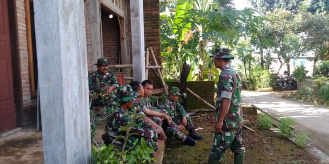 Kudus – Anggota Team Kreatif Satgas TMMD reguler ke-107 Kodim 0722/Kudus, melakukan koordinasi sebelum melaksanakan pengecekan hasil permentasi Pupuk Cair Organik di tempat Pak Partoyo Rt.02/VIII Dukuh Talun Desa Kedungsari Kecamatan Gebog Kabupaten Kudus, Jumat (10/4/2020).