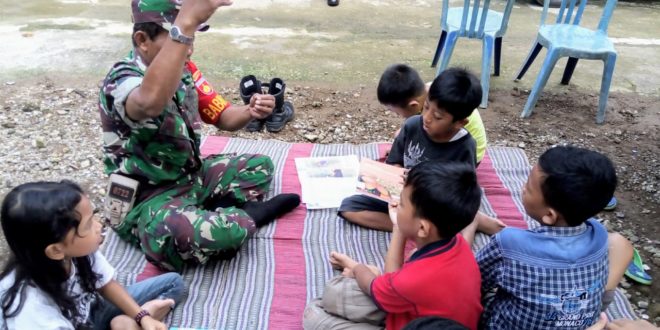 Kudus – Pelaksanaan TMMD Reguler 107 di Desa Kedungsari merupakan kesempatan berharga yang dapat dipergunakan Anggota Satgas Serka Jumeno dalam menjalin keakraban dengan lebih dekat dengan anak anak seusia Sekolah Dasar di Desa Kedungsari untuk berkomunikasi sosial serta berinteraksi dengan memberikan arahan,semangat,serta cerita cerita untuk memotivasinya,Sabtu (11/4/2020).