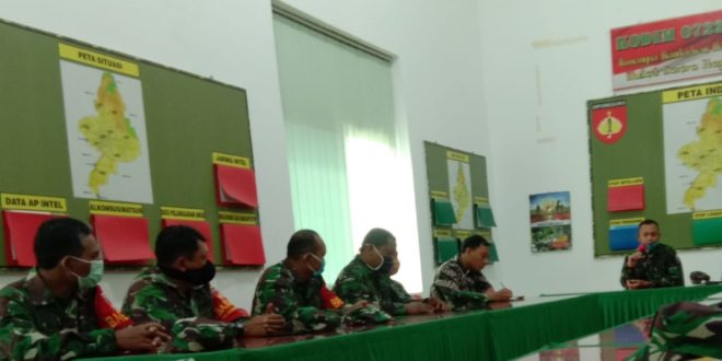 Kudus-Letkol Arm Irwansyah S.A.P Komandan Satgas TMMD Reg Ke-107 Memberikan arahan kepada Satgas Jurnalis TMMD sebanyak 20 orang di Aula Makodim 0722/Kudus untuk memberikan evaluasi kepada tim jurnalis yang sedang melaksanakan pemberitaan kegiatan TMMD Reg Ke-107 di Desa kedungsari. Selasa (14/4/220)