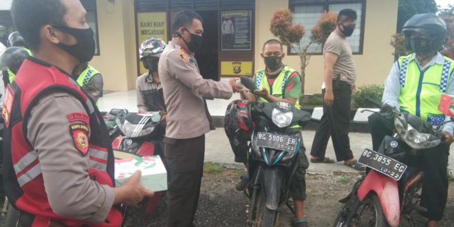 KOTA AGUNG, LhL – Dalam rangka bulan suci Ramadhan dan masa penanggulangan virus Corona atau covid-19 yang mengharuskan masyarakat untuk tidak melakukan perjalanan ke tempat-tempat keramaian dan tetap tinggal di rumah, maka Polres Lahat melalui Kepolisian Sektor Kota Agung melakukan bakti sosial dengan membagikan nasi kotak dan masker pada tukang ojek yang biasa mangkal di Desa Kota Agung. Pembagian nasi kotak dan masker oleh Polsek Kota Agung ini sebagai bentuk kepedulian terhadap tukang ojek yang sedang mengais rezeki disaat pemerintah melakukan Stayathome untuk memutus rantai peredaran covid-19.