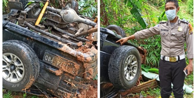 LAHAT, LhL – Diduga karena menghindari sebuah mobil L 300 yang meluncur dari depan, Minibus Mitsubishi Panther terjun bebas ke jurang sedalam 50 meter, setelah sebelumnya menabrak pagar besi pembatas jalan. Rabu, (20.05.2020).