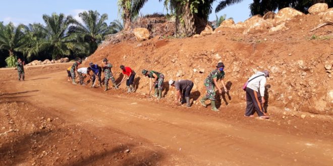 SUBANG, LhL- Anggota Koramil 0511/Pusakanagara diterjunkan bantu kegiatan TMMD ke 108 Kodim 0506/Subang. Para anggota Koramil tersebut diperbantukan membantu pembangunan jalan lintas provinsi.Rabu(8/7/2020).