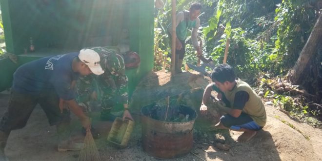 Warga begitu antusias berbaur dengan personel Satgas TMMD gotong royong membersihkan Pos Kamling.