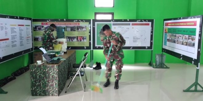 SUBANG- Tetap jaga kebersihan Anggota Satgas yang berada di Posko TNI Manunggal Membangun Desa (TMMD) reguler ke- 108 Kodim 0605/Subang, sebelum dan sesudah bekerja, di kantor Kecamatan Serangpanjang Kabupaten Subang, selalu menjaga kebersihan lingkungan. Senin (13/8/2020)