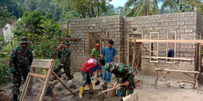 SUBANG – Pelaksanaan Rutilahu ibu Nemah (63) oleh Personel Satgas TMMD ke-108 Kodim 1014 bersinergi dengan warga sekitar, di Dusun Talun Desa Talagasari, Kecamatan Serang Panjang, Kabupaten Subang. Adapun tahapan pengerjaan bangunan ini memasuki akhir pemasangan batako yang selanjutnya akan dipasangi kaki-kaki atap rumah. Senin(13/07/2020).