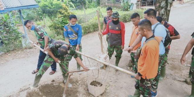 Selain Sertu Sunarjo, juga ada warga yang sedang memanggul semen. Namun supaya beban terasa ringan maka pkerjaan mengangkut material ini mereka lakukan dengan menggotong bersama meskipun hanya dengan menggunakan peralatan seadanya.