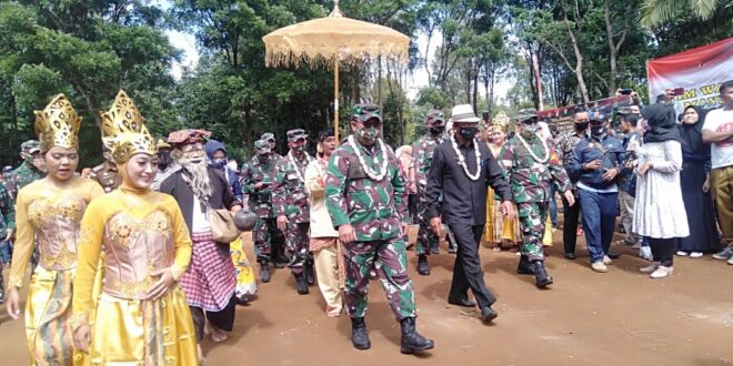 Mayjend TNI Jani Iswanto, M.A beserta rombongan disambut dengan kesenian Lengser yang merupakan tradisi ciri khas masyarakat Jawa Barat sebelum memasuki lokasi TMMD.
