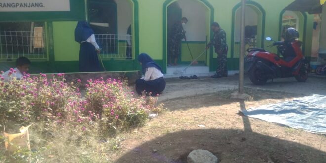 Nampak tidak hanya personel TNI dan warga masyarakat saja yang terlibat dalam kegiatan ini, namun sejumlah pelajar juga turut ambil peran dalam membantu kegiatan pembersihan masjid ini.